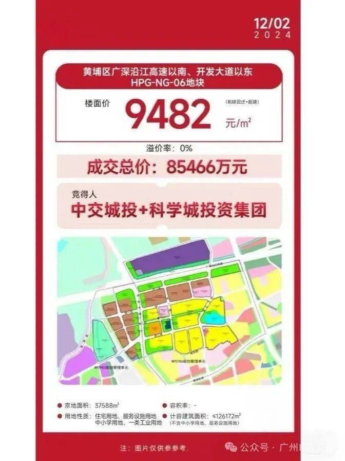 2024 年 12月2日,黄埔区广深沿江高速以南、开发大道以东HPG-NG-06地块,由中交城投、广州峻森投资以底价拿下,该地块起拍价8.5亿,总建面12.6万平。剔除3.09万平回迁+5149平配建,折合楼面价9482元/平。