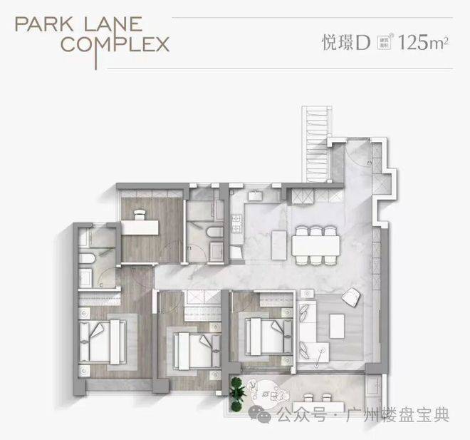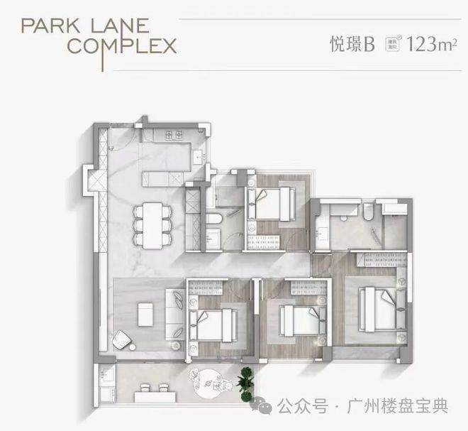 123平改善型四房产品则更强调家庭长期居住舒适度。该户型三卧室朝南布局,保证主要生活空间获得充足日照资源。厨房系统采用半开放式中西厨房设计,并结合LDKG空间结构(客厅-餐厅-厨房-生活阳台一体化设计理念),使得家庭生活动线更加流畅。主卧室通常配备独立卫浴空间,形成主套式生活结构。该产品更适合多成员家庭长期居住需求。