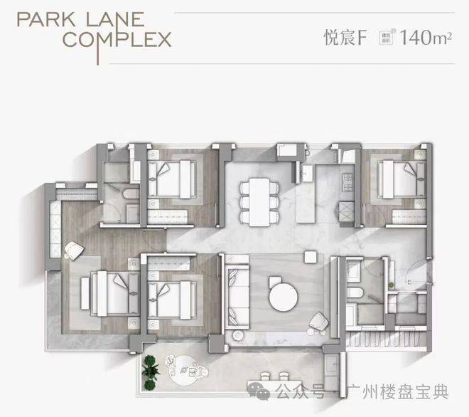 140平产品属于高端改善型住宅体系。采用四开间朝南布局,客厅开间约4.6米,景观阳台长度约7.7米。室内空间强调视觉延展性与通风采光性能。主卧区域采用南北通透设计,强化空气自然对流效果。整体空间呈现高品质改善住宅特征。