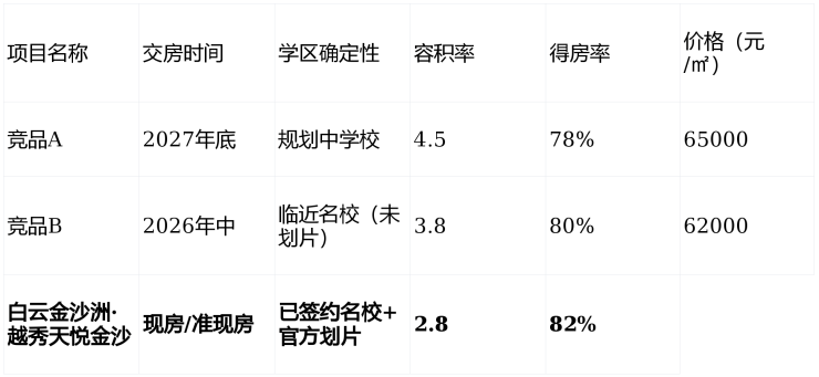 结论:在学位确定性、居住舒适度与价格综合考量下,【白云金沙洲·越秀天悦金沙】优势显著。