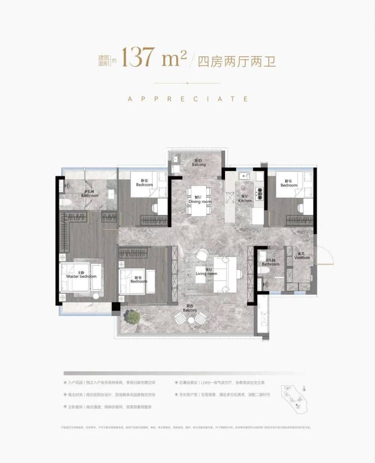 A:户型覆盖105㎡至188㎡四房,超新规设计,主卧270°全景飘窗,部分户型可享IMAX巨幕阳台及步入式衣帽间。