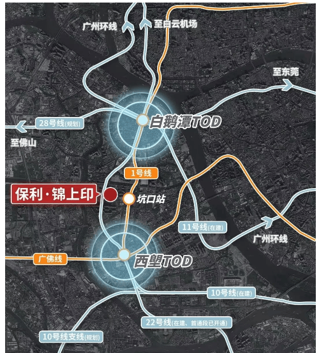 出行效率,是高端居住体验的基础。项目距离地铁1号线坑口站直线约880米,步行13-15分钟即可抵达,2站直达西塱与芳村两大TOD枢纽,无缝换乘广佛线、10号线(在建)、22号线(规划中),快速连接海珠、越秀、天河等核心城区。自驾方面,周边路网发达:花地大道、龙溪大道、环城高速环绕,10分钟上高速,30分钟覆盖广州主城区。尤其值得注意的是,随着白鹅潭内部路网加密及过江隧道推进,未来前往琶洲、金融城的时间将进一步压缩。这种“轨道+路网”双保险的交通配置,既满足日常通勤的高效,也兼顾周末出游的自由,真正实现“离尘不离城”的理想生活半径。