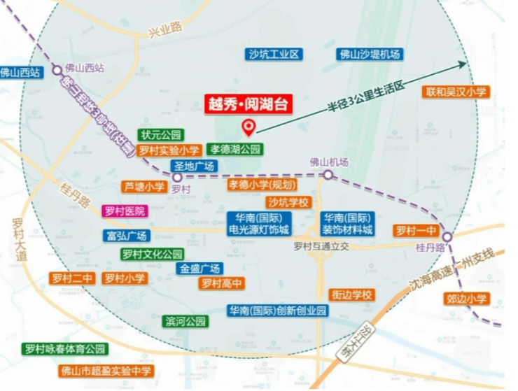 项目位于狮山罗村核心区,周边产业与生活配套完善。狮山GDP占南海区三分之一,拥有超20家世界500强企业支撑区域经济发展。佛山西站枢纽新城打造大湾区西门户及产城融合区,配套涵盖商业、教育、医疗及公共设施,推动区域整体价值提升。阅湖台借助周边高端产业及城市功能聚集,实现居住价值与投资潜力的双重保障,成为狮山湖居生活典范。