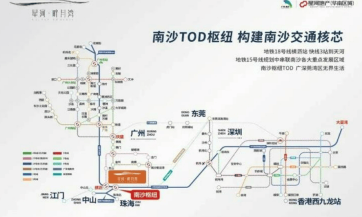 对于星河·畔月湾而言,项目周边可便捷接驳地铁18号线横沥站,通过轨道交通网络可以实现向北进入番禺以及天河核心区域,同时向南连接南沙综合交通枢纽。该枢纽未来将实现地铁、城际铁路以及高速铁路的多轨道交汇,使南沙在区域交通体系中的枢纽地位进一步加强。借助这一交通网络,南沙与深圳、香港、澳门等城市之间的联系也将更加高效。