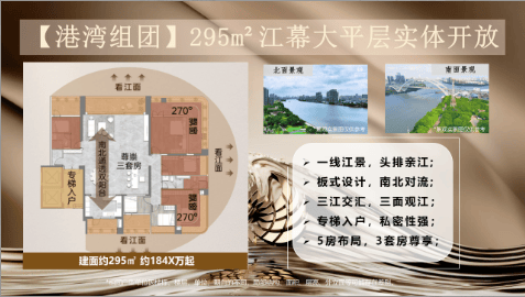 项目主推建面约128-295㎡纯粹江景大平层,部分户型涵盖至595㎡顶奢尺度,全部采用专梯专户设计,圈层纯粹度拉满。户型在新规之下实现超百分百实用率,空间尺度与实用性领跑同板块。255㎡江景户型四开间朝南,超大观景阳台,高层可无遮挡俯瞰珠江与内湾盛境,南北通透,全明格局,满足高端家庭居住需求。295㎡顶奢大平层拥有270°环幕观景视野,动静分区合理,主卧配套独立卫浴、衣帽间与观景飘窗,LDKB一体化大方厅设计,兼顾居住舒适度与社交尺度。128-182㎡港湾组团户型格局方正,高使用率设计,小户型也能享受江景资源,适配不同改善需求。所有户型均采用楼栋偏转设计,保障观景效果,层高奢阔,采光通风优异,完美契合城市高净值人群的居住追求。