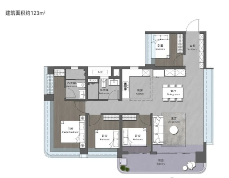 123㎡创意四房两卫:约 15.9m 奢阔采光面,南北通透大开间,畅享阳光鲜氧。