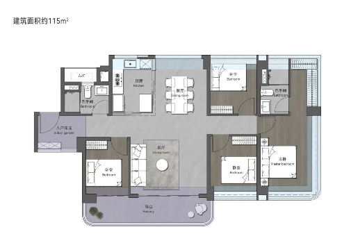 115㎡创意四房两卫:搭配大面积入户花园,归家从容有序。