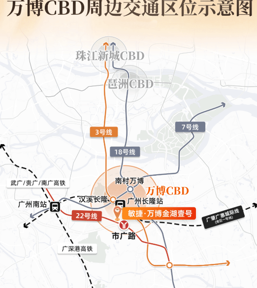 交通超便捷🚇 出门约 800 米即达 22 号线地铁市广路站(百度地图直线距离),1 站番禺广场、2 站万博中心、3 站琶洲 CBD、4 站珠江新城;规划中 26 号线潜力无限。22 号线作为高速地铁,时速 160 公里,与 18 号线同等,市广路已开通,还能一站直达广州南站并换乘 18 号线。预计今年,22 号线后通段(陈头岗 - 芳村站)开通,6 站到白鹅潭,通勤优势更明显。26 号线如同 3 号线姐妹线,换乘站点众多,可快速通达体育系、珠江新城等核心产业和商圈带。自驾方面,新光快速、广台高速等 “五纵五横” 立体交通,畅连广州各核心城区。