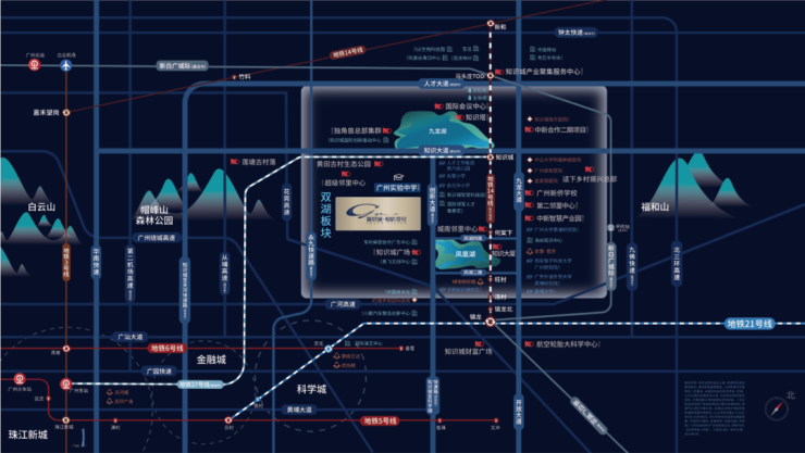 除社区自建的约6500㎡国际风情商业街(建设中)外,项目2公里半径内已有绿地缤纷城、城南邻里中心等成熟商圈。更值得关注的是规划中的27万㎡超级邻里中心——集体育馆、生鲜超市、酒店式公寓与高端办公于一体,借鉴新加坡淡滨尼模式,将成为知识城首个文体商融合综合体。医疗方面,中山大学附属肿瘤医院(黄埔院区)已投入使用,南方医院知识城分院也在建设中。生态资源尤为突出:南靠帽峰山,北望凤凰湖,西临300万方九龙湖,日常晨跑或骑行都有天然氧吧相伴。