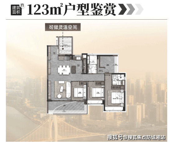 建面约123㎡户型,创新性打造4+1房设计,空间宽敞舒适,四开间朝南,双面宽景观阳台长约6.5米,室内采光通风畅意,可随时沐浴阳光,同时能俯瞰海珠湿地公园美景。该户型最具特色的是“魔方空间”,设备空间、厅卧均可作为灵活空间,相当于在三房基础上增加两个多功能室,厅卧合并后可改成约62㎡LDKG大方厅,空间阔绰,远超同面积段户型,适合三口之家、四口之家居住,兼顾居住与休闲需求。