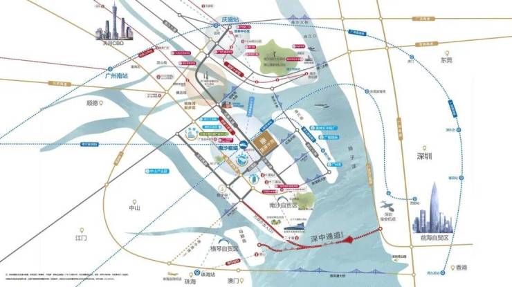 未来枢纽核心——南沙枢纽: 如前所述,紧邻项目的南沙枢纽是面向未来的超级交通工程。它不仅是广州南部的高铁门户,更将引入多条跨江铁路通道,直连深圳、东莞。特别值得关注的是,它与深中通道的连接。深中通道预计通车后,从南沙到深圳前海等地的车程将大幅缩短,进一步促进珠江口东西两岸的融合。项目临近该通道在广州侧的出口,对于频繁往来广深两地的商务人士或双城家庭而言,价值不言而喻。