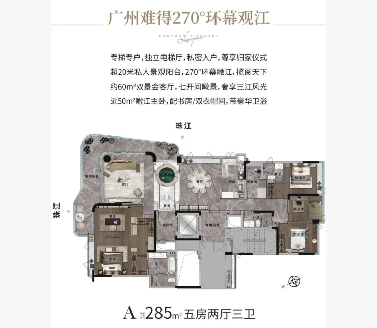 户型是人居的核心载体,更是生活品质的直接体现。广州兰园江悦立足塔尖人群的改善型居住需求,精准定位高端大平层市场,仅规划约193㎡与285㎡两种户型,均采用专梯专户设计,以“奢阔尺度、通透格局、江景视野、私密空间”为核心特点,兼顾实用性与尊崇感,每一处设计都经过精心打磨,适配不同家庭结构的高阶居住需求,彰显顶藏级豪宅的品质与格调。