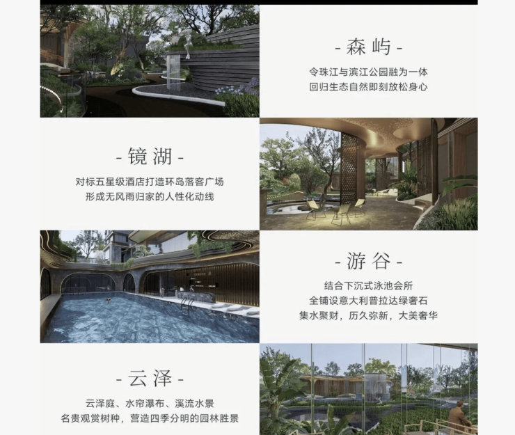 从园林景观到室内精装,从空间布局到细节打磨,我们始终以极致标准,诠释高阶人居的真谛。蓝调国际大师主笔打造“森屿、镜湖、游谷、云泽”四重景观礼序,溯源广州在地文化,以珠江为脉络,构建层层降噪的诗意归家动线;精选鱼肚白、普拉达绿等豪宅御用天然奢石,搭配德国嘉格纳、高仪,瑞士劳芬等国际一线品牌,以顶豪装标,定义人居新高度;对标香港瑰丽酒店的会所设计,打造五星级酒店式双会所与下沉式泳池,让酒店生活哲学融入日常,构建圈层私属社交场。