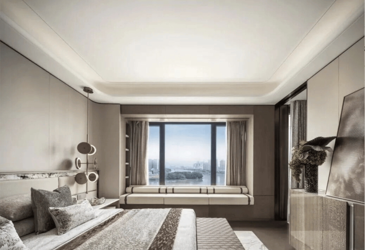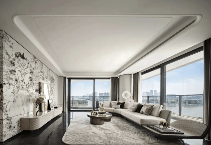 样板间整体设计风格简约大气、低调奢华,摒弃冗余的装饰,以“少即是多”的设计理念,凸显空间的奢阔感与通透感,同时融入岭南在地文化元素,将珠江流水的灵动与岭南建筑的雅致融入其中,打造兼具现代感与文化底蕴的居住空间。设计灵感源于全球限量游艇阿斯顿马丁AM37,流动的柔美线条贯穿整个空间,与珠江流水相呼应,营造出灵动而尊贵的空间氛围,呼应项目“珠江头排艺术奢宅”的定位。