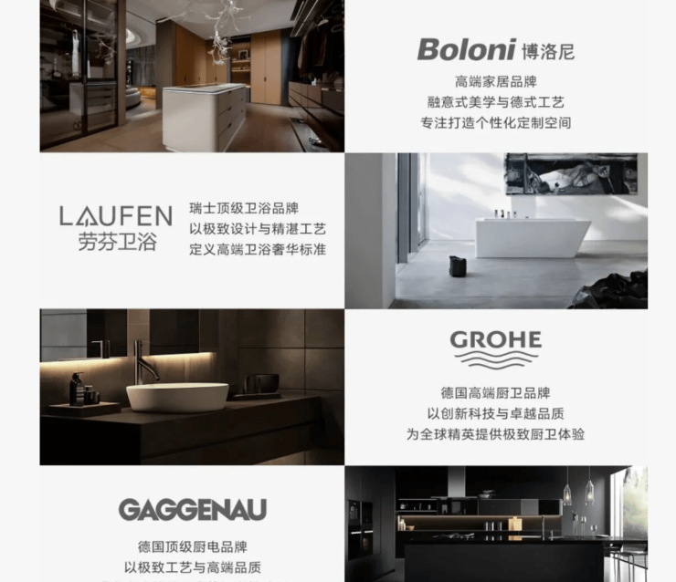 室内精装方面,样板间全面呈现项目的顶豪交标,全屋采用德国嘉格纳、高仪,瑞士劳芬等国际一线品牌,涵盖厨具、卫浴、家电等全维度,既保证了产品的品质与耐用性,又提升了生活的便捷度与舒适度。厨房采用开放式设计,搭配嘉格纳高端厨具,满足业主的烹饪需求,同时与餐厅相连,形成一体化的生活空间;卫生间采用干湿分离设计,搭配劳芬卫浴、高仪花洒,细节之处彰显匠心,为业主提供舒适的洗漱体验。
