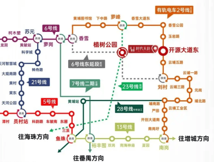 更值得期待的是,项目周边还有规划中的地铁 6 号线东延段和 23 号线,两条线路将在附近的植树公园站交汇,未来轨道交通网络会进一步升级,公共交通出行会更加便捷。根据黄埔区人民政府工作报告,该区正加快完善轨道交通体系,推进多条地铁线路建设,时代天韵所在板块的交通红利还在持续释放广州市人民...。