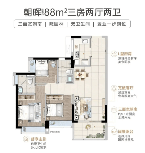 88㎡三房两卫:199 万起,刚需首套首选