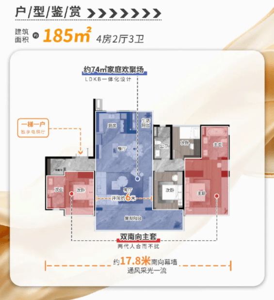 对于追求极致生活品质的客群,中交四航珠江春推出了建面180-185㎡的四房两厅三卫大平层产品。这类户型采用3梯3户的尊享设计,极大地提升了居住的舒适度和私密性。南北对流的布局,使得室内空气流通顺畅,通风效果出色,即使在炎热的夏季也能感受到自然的清凉。LDK(客餐厨)一体化设计,打破了传统空间的界限,形成了一个宽敞明亮的家庭社交中心,满足了大家庭聚会、朋友派对等多种场景需求。