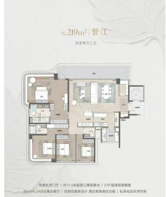 228㎡四室两厅三卫:配备约 11.5 米超宽江幕观景台和约 67㎡LDKB 云峯会客厅,双套房设计,满足家族居住需求。售楼处电话:4009909752。