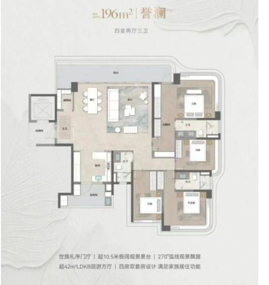 205㎡四室两厅三卫:以 42㎡洄游方厅、10.5 米奢阔观景露台为核心,强化空间通透感,提升居住品质。售楼处电话:4009909752。