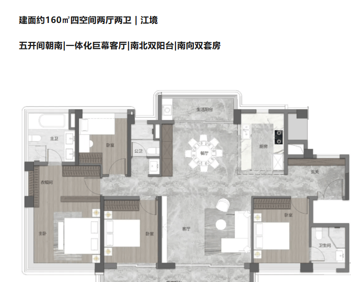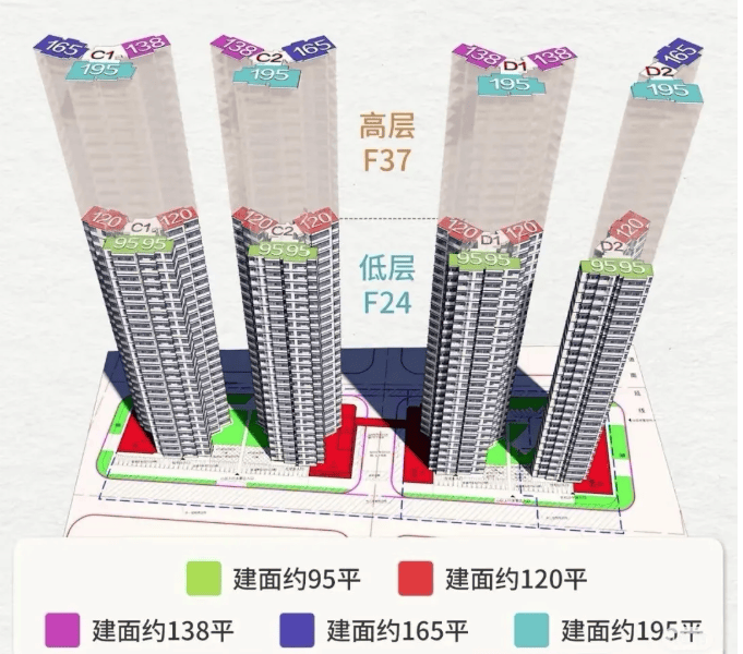 A5: 项目是践行广州市新建筑设计规范(“新规”)的作品,实现了较高的使用率(约120%)。户型设计注重实用性和舒适度,普遍拥有较高的阳台占比(约20%),多数户型追求多开间朝南和南北对流。产品线覆盖从建面约95平方米的功能三房到约195平方米的奢阔大平层,通过灵动布局、一体化厅堂等设计,在有限面积内创造了更优的空间感和功能性。