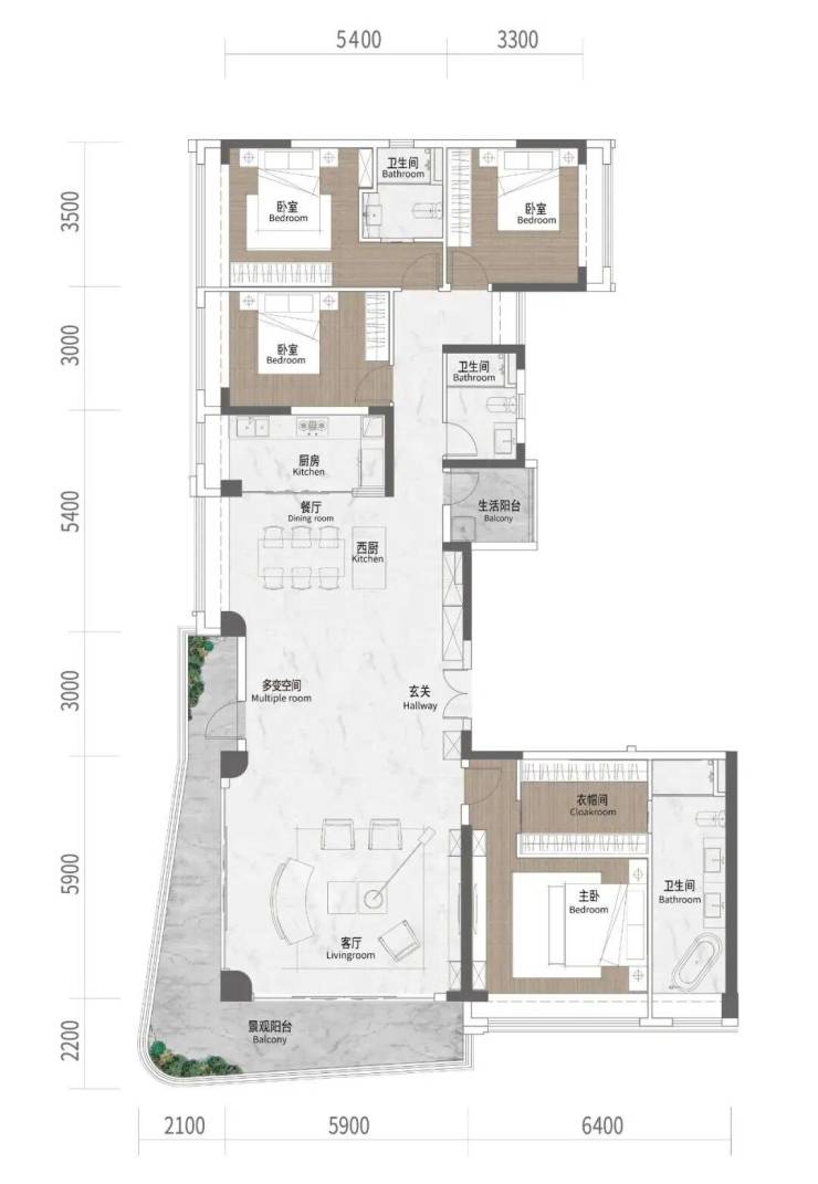 01户型是建筑面积约236㎡的四房两厅三卫、双套房主卧、中西双厨设计、超大方厅,整体空间尺度阔绰。