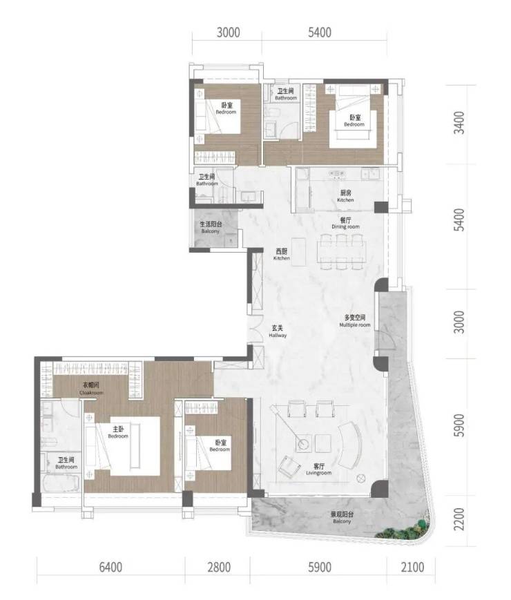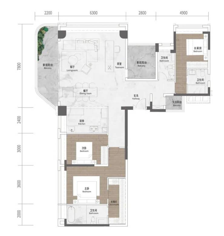 其中,建筑面积198㎡的四房带7.8米L型景观阳台,可揽东平河及小区园林双景,主人房面积几乎与客厅持平,居住尺度十分阔绰。