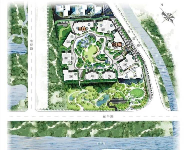 从规划总平面图来看,8座和10座位于项目北部,正前方3/4座为叠墅小高层,楼层较低,对其视野影响较小,大部分户型可直望东平河江景。