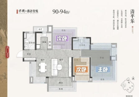 90-94平米横厅三房两卫:客餐厅开间约6米,主卧带270度飘窗。