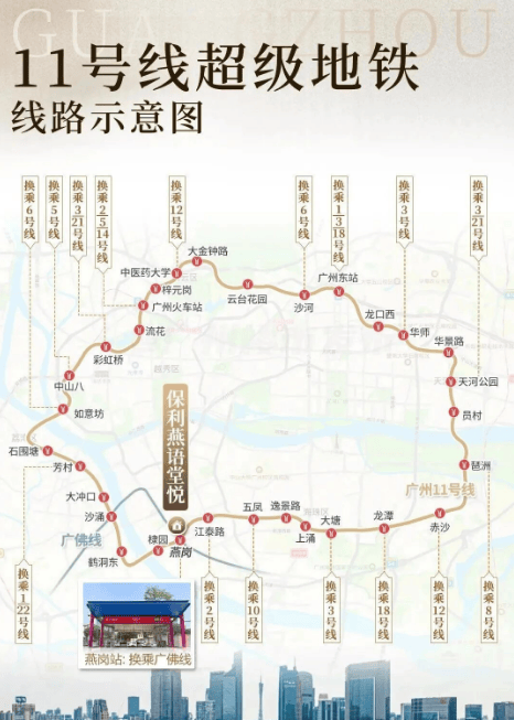 保利燕语堂悦紧邻在建中的11号线和广佛线交汇的燕岗地铁站,距离仅不到200米,是真正的地铁上盖项目。从这里出发,8站直达琶洲,7站到珠江新城,出行极为便利。
