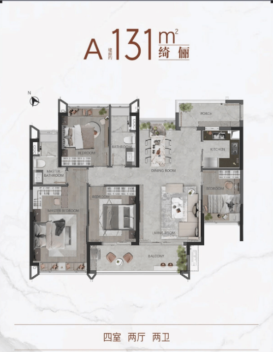 131㎡四房两厅两卫: 舒适改善,总价约500-520万。南北对流设计,通风优良。提供主阳台朝南(采光好)或朝北(看湿地)两种选择,适合多人口家庭。