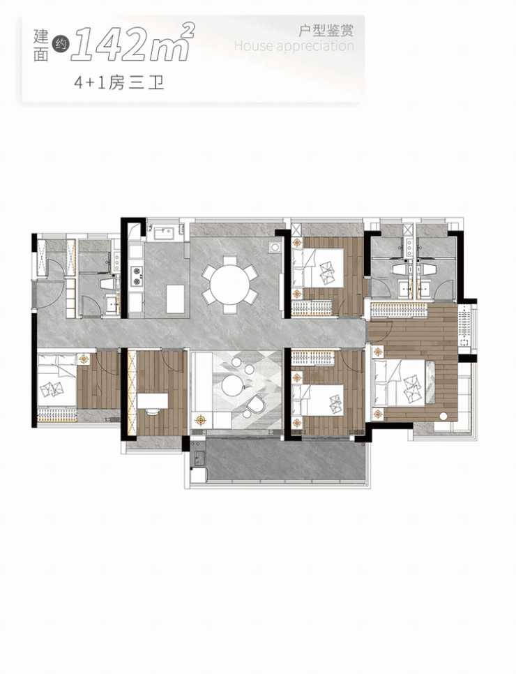 142㎡,在别人都在做3、4房的时候,珠实西关都荟做到了4+1房,5开间朝南,双主套。在荔湾市场里,算是第一个。