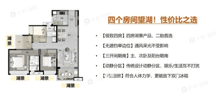 产品:建面约88-143㎡三至四房,全南向设计,270°环幕湖景视野