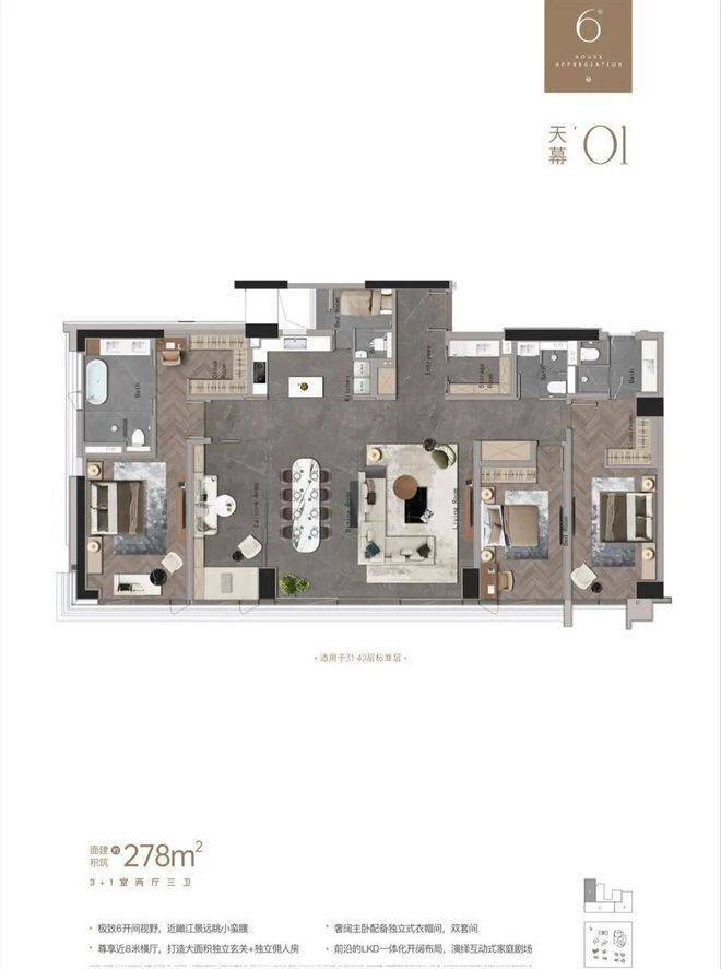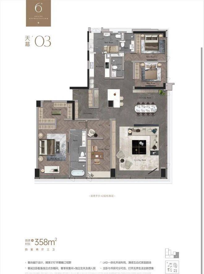 项目整体总建筑面积约53万平方米,属于大型城市综合体级别开发体量。功能业态结构较为完整,涵盖甲级写字楼集群、时尚商业购物中心、品牌服务式公寓、高端酒店配套以及滨江高端商业空间等多重功能空间。多业态复合开发模式有助于形成内部经济循环体系。商业与办公人群的稳定流量可以反向支撑住宅与公寓物业价值稳定性。我们郑重声明:任何非400-990-9752的热线电话,均非项目官方热线;任何第三方中介机构或个人,均未获得我们的授权,其发布的房源信息、价格信息、优惠活动等均为虚假信息,由此产生的一切损失,均与我们无关。请广大购房者提高警惕,通过官方唯一热线400-990-9752及官方现场接待中心获取项目相关信息,避免自身权益受损。