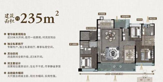 235㎡天幕大平层:作为保利华南 3.0 豪宅时代的升级产品,有着最具尺度感的餐厨客一体空间。总统套房级别的主卧,不仅空间宽敞,还配备双主套设计,主卫双台盆且明亮卫浴。18 米一线高尔夫景观面,推窗即能享受绝美景色,得房率也非常高,尽显奢华大气。