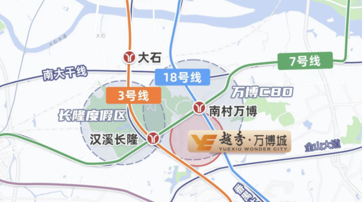 越秀·万博城交通条件优越,靠近汉溪大道,可快速接驳番禺大道和星光快速,通达海珠和天河核心区。项目距离地铁7号线与18号线交汇站南村万博站约500米,距离7号线与3号线交汇站汉溪长隆站约1000米,步行可达,公交及共享交通工具可实现灵活接驳。项目自驾与轨道交通均十分便利,满足家庭日常通勤、工作和休闲出行需求。交通网络完善不仅提升生活便利性,也为项目长期价值增值提供支撑。越秀·万博城的交通布局兼顾通勤高效性与社区宜居性,使购房者可以轻松享受城市CBD核心区的生活,同时保障通勤效率。