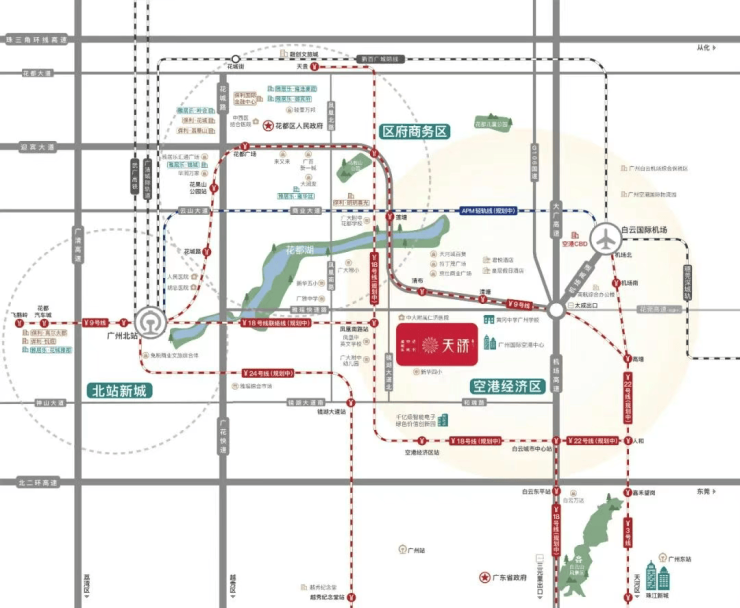 交通的通达性,不仅关乎日常通勤的效率,更决定着生活的半径。中建保利雅居乐·天骄坐落于花都空港核芯区,占据着“空铁融合”的核心优势,多维立体交通网络畅达四方。项目距已开通的地铁9号线清塘站约1.5公里,步行或搭乘短途接驳车便能轻松抵达,快速串联广州中心城区;临近规划中的24号线镜湖大道站与18号线北延长线凤凰南站,未来三地铁汇聚,18号线开通后更是能实现3站直达珠江新城CBD,让在核心区工作的业主,轻松实现“工作在城芯,居住在低密”的理想生活。
