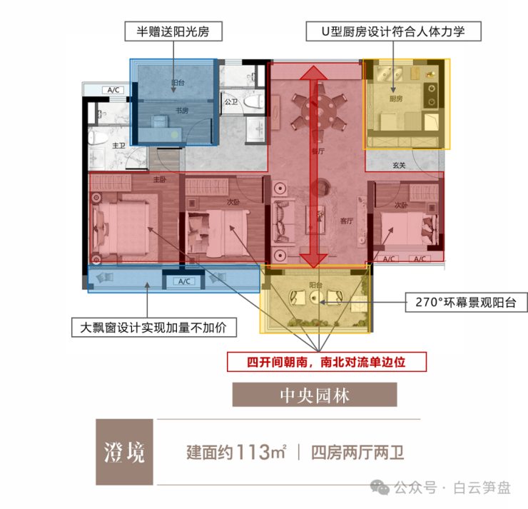 3、产品方面,户型设计较为偏中高端改善型户型,三四房都特别强调户型采光,小区密度较低,26层及31层围合式设计,留有较宽楼间距,加上园林跟白云湖双景观,让小区整体上比较舒适。