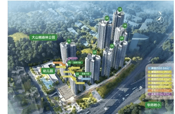 从城市界面看,板块内高楼林立、路网完善、人口导入稳定,已形成成熟的居住氛围与消费活力。而东悦府西侧紧邻的大山乸森林公园(约946万平方米),不仅是天然氧吧,更是稀缺的城市生态屏障,在高度开发的区府板块中独树一帜。