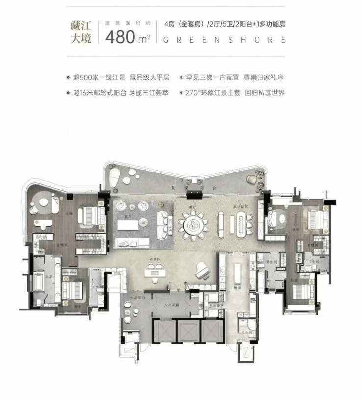 在大平层之上,南天名苑更推出『悦岛』组团约365㎡环幕江景大宅,以及『湾流』480㎡天幕揽江大平层。前者以5房双套房、3阳台+1工人套房的格局,诠释奢适生活的极致尺度;后者则以4套房+1多功能房的设计,成为4.0时代的人居范本。