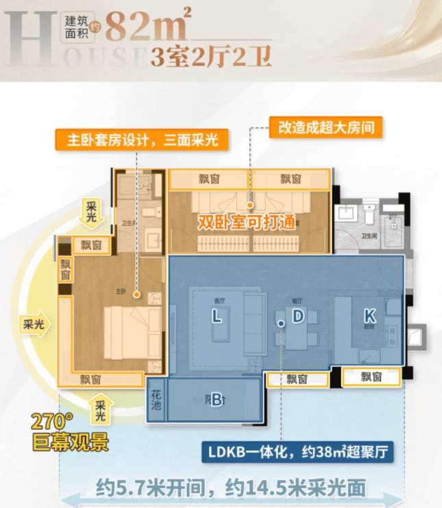 77㎡与82㎡户型则进一步升级,实现四开间朝南、超11米南向采光面,82㎡更采用稀缺横厅设计,客餐厅开间达约5.7米,搭配270°观景视野,真正做到“小面积、大享受”。