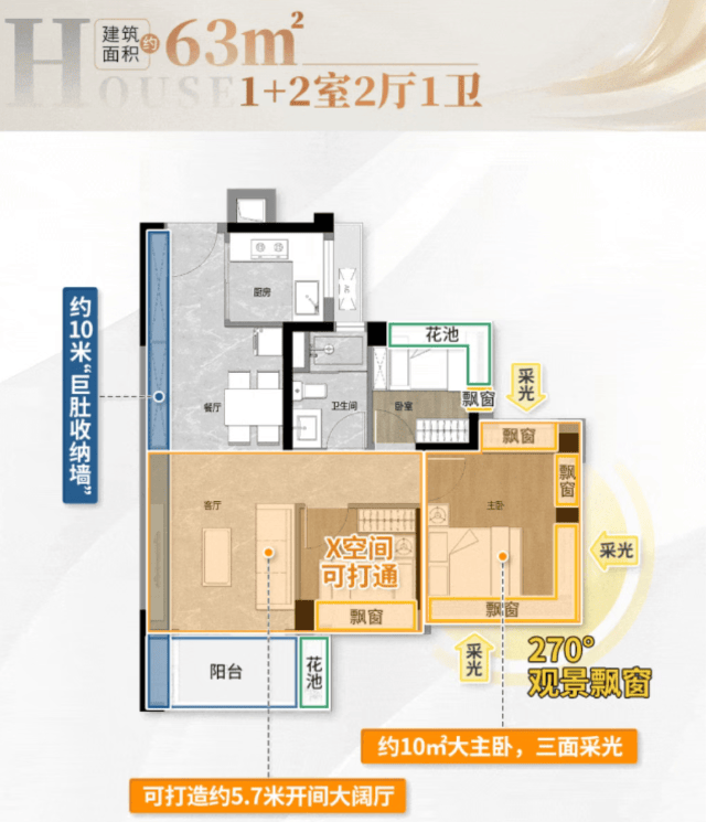 项目二期主推建面约63-82㎡三房产品,通过创新布局,实现最高达107%的实用率,远超市场平均水平。以63㎡三房为例: