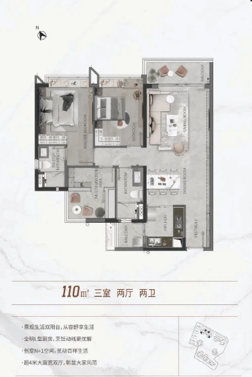 110平方米B、C两种户型,分别以良好的采光和宽敞的厨房操作台为特点。