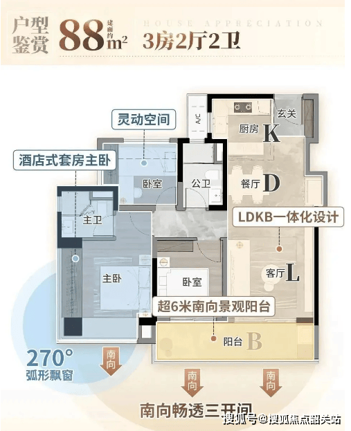 使用率超 105%,实测使用面积约 110㎡,三开间南向,采光面达 12 米,客厅与两个主卧均朝南,江景视野最佳(高楼层可眺望珠江);