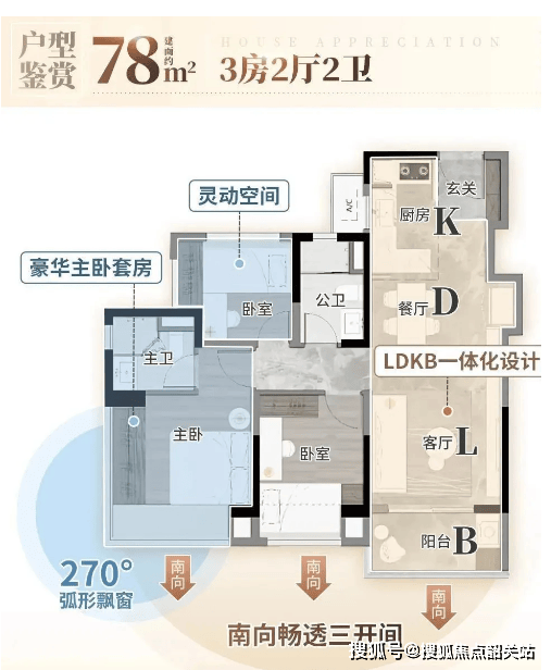 使用率超 100%,实测使用面积约 78㎡,全南向布局,采光面达 8 米,客厅与主卧均朝南,确保室内明亮通透;