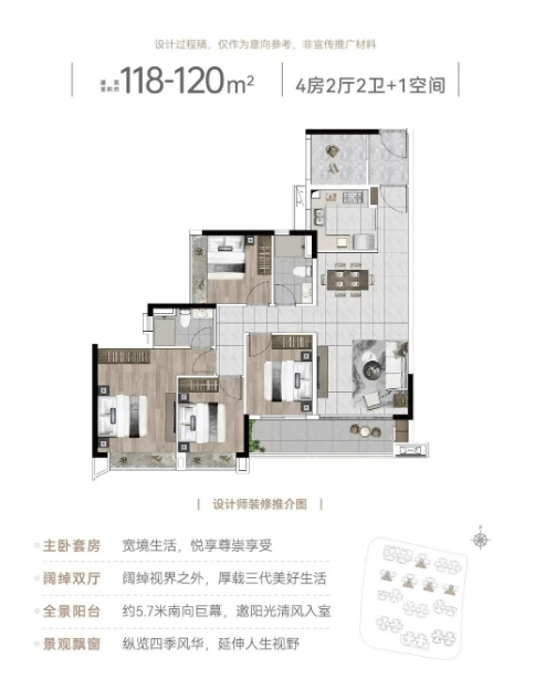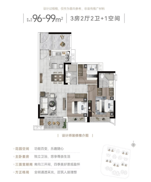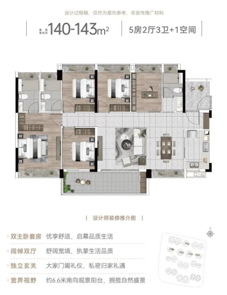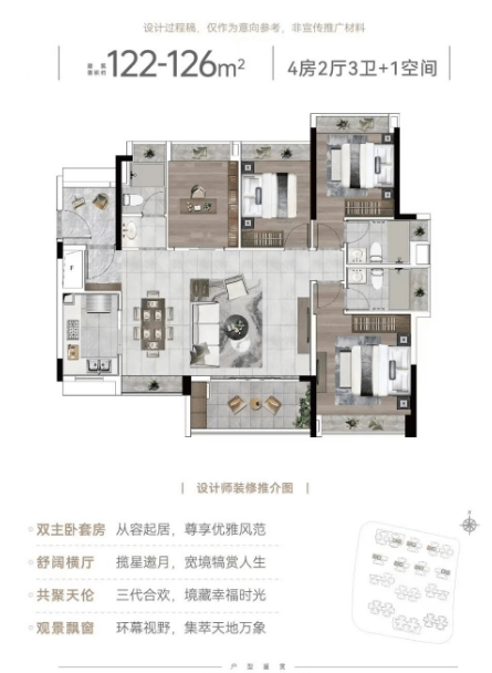 项目主打96至142平方米的户型,其中以四房两厅为主打产品,满足不同家庭的需求。特别是126平方米的双主套四房户型,更是受到市场的广泛关注。