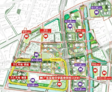 教育配套是傲璟组团的核心卖点之一,项目与省实荔湾学校花地湾校区直线距离约 300 米,该校为 54 班规模的九年一贯制学校,涵盖小学部(36 班)和初中部(18 班),教育质量有保障(具体入读政策以当年教育局公布为准)。此外,整个万汇天地规划了 7 所幼儿园、3 所小学、3 所中学,形成完整的教育链条,从幼儿园到初中都能就近解决,家长无需为孩子上学问题发愁。需要注意的是,虽然学校为九年一贯制,但初中阶段仍需参加荔湾区统一摇号分配。