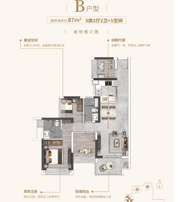 广钢花城的产品力,核心在于“小而精、精而变”。主力户型87㎡与89㎡均为3房2卫+1灵活空间,得房率超90%,实际使用感接近百平。两大户型均采用三开间朝南、主卧套房、餐客一体设计,采光通风极佳;89㎡更采用经典竖厅,动静分区明确。而114㎡五房户型,则以LDK一体化、四开间朝南、巨幕阳台打造“一步到位”的改善体验。尤为值得一提的是“+1空间”设计——可作书房、儿童房、电竞室或储物间,满足Z世代多元生活需求。在当前广州新房普遍得房率70%-80%的背景下,广钢花城用“偷面积”合规化+高效动线,重新定义小户型价值。