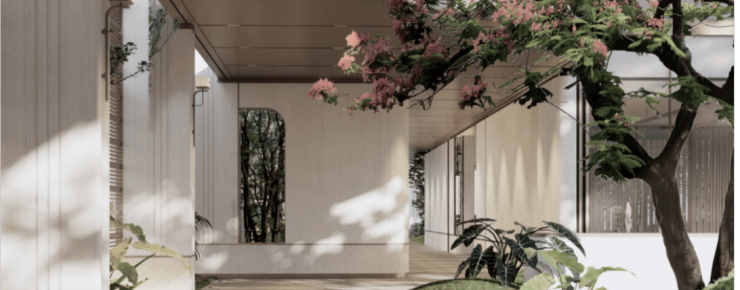 园林设计主题为“归心六屿与浮岛花园”。我们在实地探访中发现,项目复刻了安缦酒店的游廊体验,打造了约160m林影游廊、约1500㎡浮屿之心、约1000㎡无界漂浮泳池。这种“层层递进、移步异景”的归家动线,让回家变成了一场穿越森林的旅行。