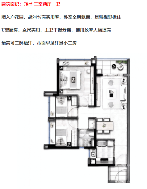 78㎡三室两厅一卫:赠入户花园,超 94% 高实用率,卧室全明飘窗,U 型厨房,主卫干湿分离,最高可三卧瞰江。